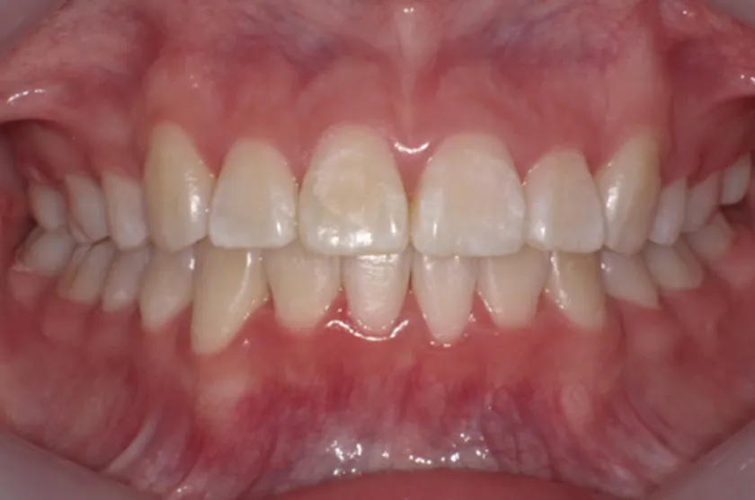 左上の空隙がほぼ閉鎖し、上下顎の正中が合ってきている。(写真b)