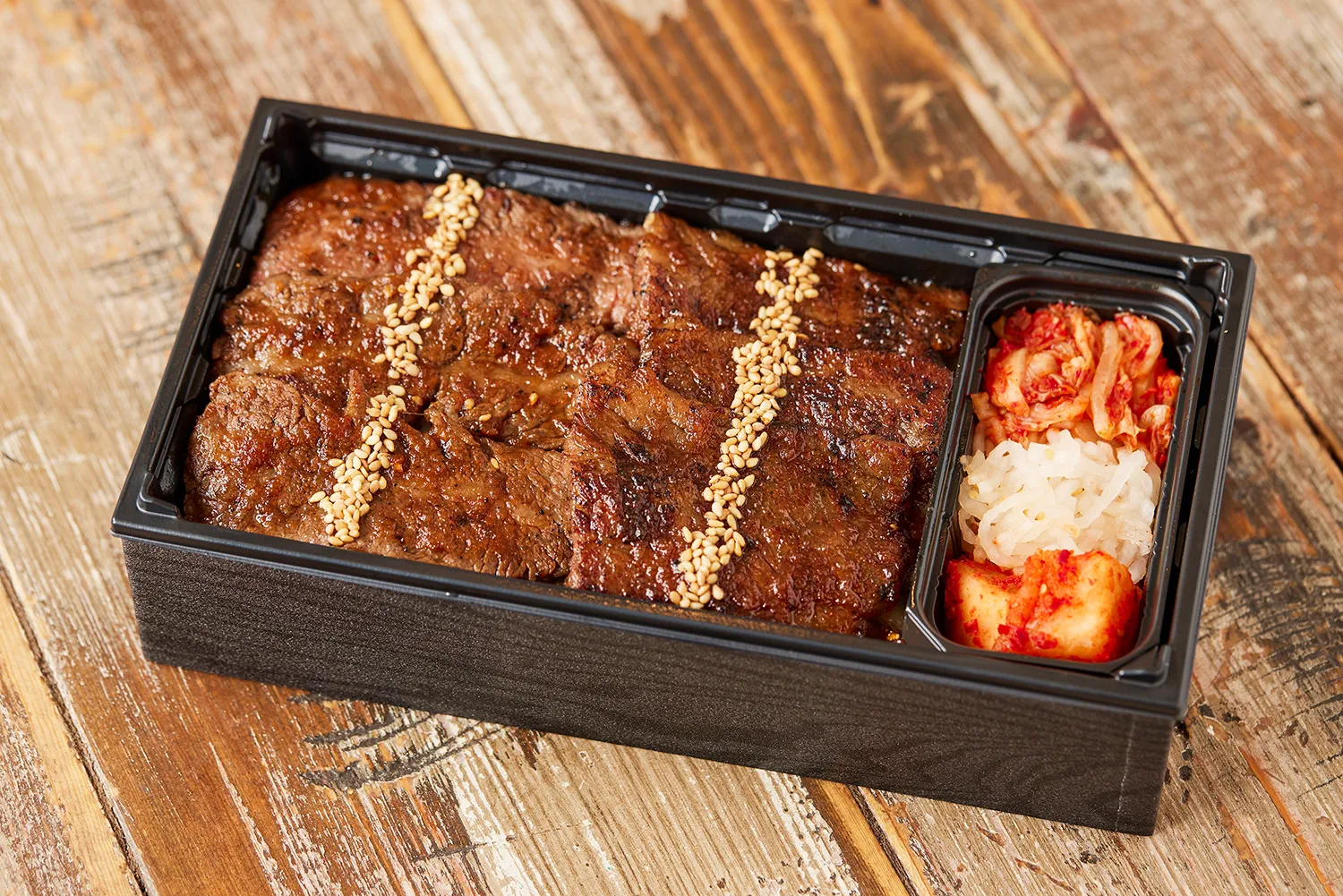和牛カルビの中でもジューシーなタテバラ、カイノミ、ササミをたっぷり120g使用しました。ご飯が進むTHE焼肉弁当。