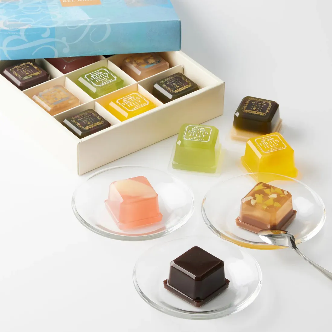 ショコラの香りと餡の風味がふんわり広がる、こだわりのショコラ水羊羹と、つるんとなめらかな口当たりのフルーツゼリーの詰め合わせ。