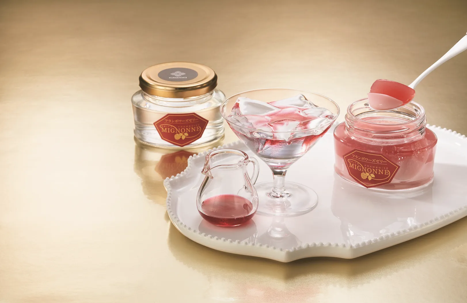 「あきたフランボワーズミニョンヌ」の甘酸っぱい風味を生かした、フルーツソースをかけて楽しむ世界遺産・白神山地の伏流水を使ったゼリーと、ホワイトチョコレートとのマリアージュが味わえるゼリーのセット。