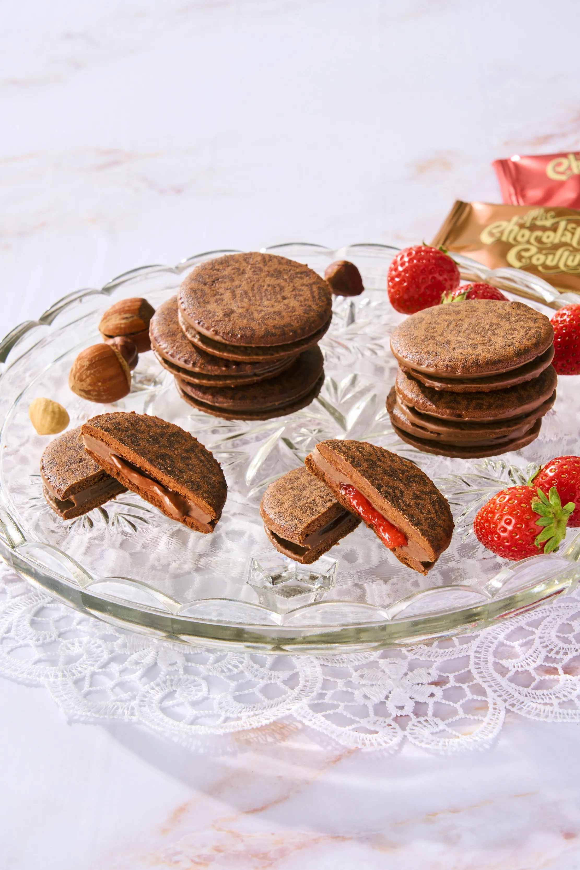 濃厚なヘーゼルナッツクリームと、爽やかな酸味のストロベリーソースをそれぞれミルクチョコレートでコーティングし、さっくりと焼き上げたココアクッキーでサンドした、贅沢な味わいのショコラサンド。