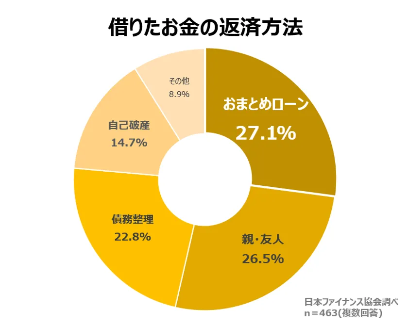 借りたお金の返済方法第2位は「親や友人」で、全体の26.5%の人が親や友人からお金を借りて返済していることが分かりました。