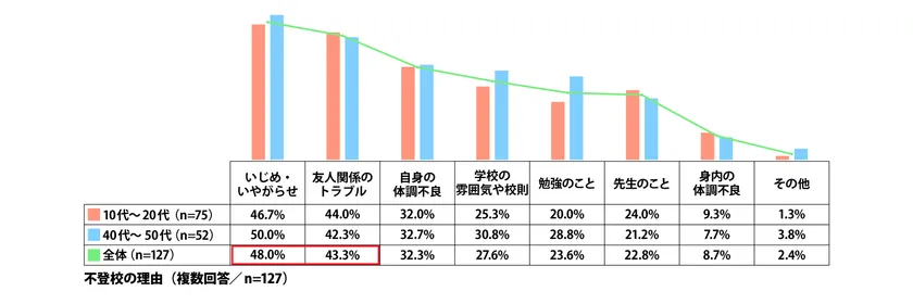 不登校の経験では、10代~20代 25.0% 40代~50代 17.3%となり、その差は7.7ポイントとなりました。不登校という選択をすることができる環境になっているのではないでしょうか。