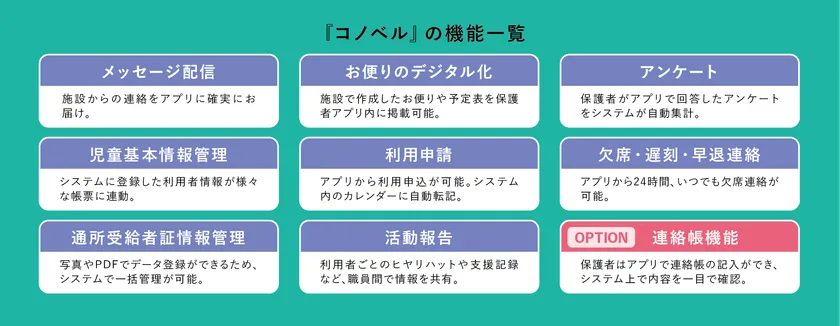 以下の機能をはじめとして、放課後等デイサービスに特化した機能を揃えてまいります。