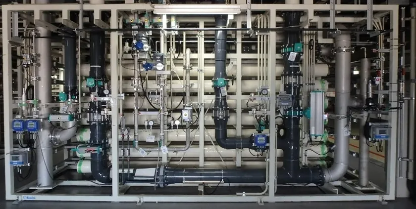 水中のイオン類や有機物を除去する膜で、主に半導体・液晶の製造に必要な超純水分野や、各種民間工場における排水回収、さらには海水淡水化プラントなどの分野で使用されています。同装置の運転には、給水ポンプで原水に高圧力をかけて膜を透過させる必要があるため、その電力消費量の大きさが水処理産業の重要な課題の一つとなっています。過去に検証で対象となったラインでは、同装置がライン全体の電力消費量の約6割を占めていました。