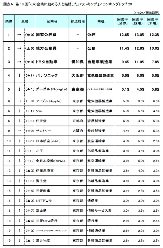 結婚相手の勤務先として望む企業を既婚・未婚別に集計したところ、1位~3位は共通して「国家公務員」、「地方公務員」、「トヨタ自動車」の順となっており、4位以下に関しては、既婚者では4位「パナソニック」、5位「ソニー」、「日本航空(JAL)」、未婚者では、4位「アップル(Apple)」、5位「グーグル(Google)」という結果となりました。
