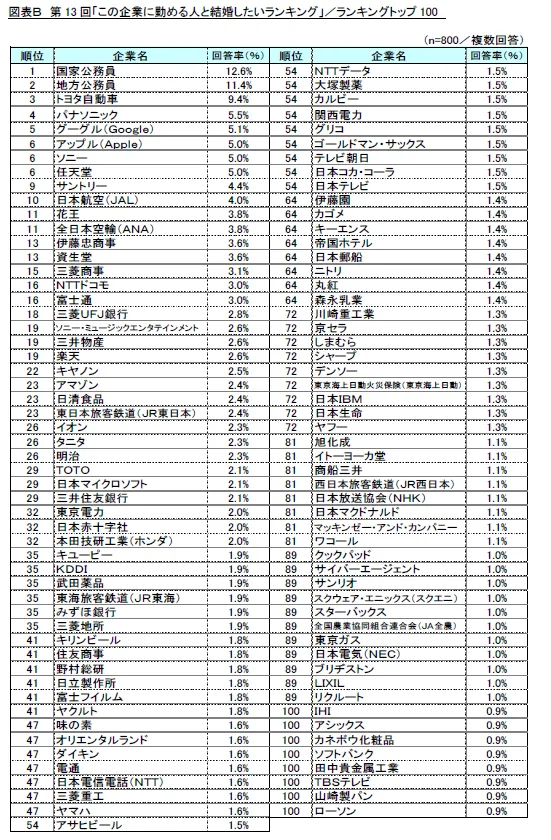 ・調査名称 :第13回「この企業に勤める人と結婚したいランキング」調査