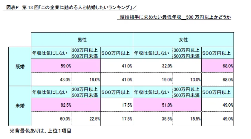 結婚相手に望む最低年収について、「500万円以上」を求める割合を既婚・未婚別、男女別に集計したところ、未婚者よりも既婚者、男性よりも女性の方が「500万円以上」を求める割合が高い傾向が表れる結果となっています。特に既婚女性においては、「500万円以上」(同68.0%)が7割近くに達しており、結婚相手には最低でも「平均年収」程度の収入を求めたいと考えている様子がうかがえます。(図表F)