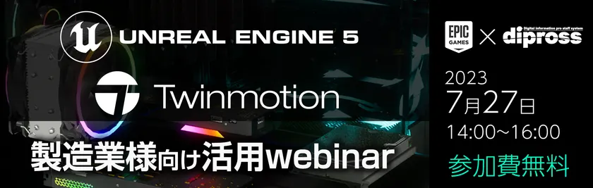 世界的なゲームエンジン開発企業であるエピック ゲームズ ジャパン様からは建設業向けとして普及してきたTwinmotionを製造業で活用するメリットや、TwinmotionとUnreal Engine 5の使い分けについて講演いただきます。ディプロスからはUnreal Engine 5を使用した製造業での活用例として製品紹介動画作成の流れについて講演いたします。