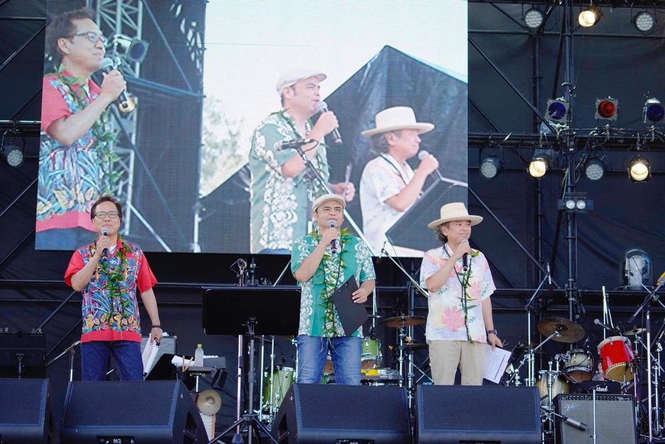 オープニングの一曲目は、うるま市との縁を伝えるために「ウルマメロディー」からはじまった。戦後、食糧不足となった沖縄に、沖縄の食文化を支える「豚」を届けてくれたのは、ハワイに住む沖縄出身の日系移民の方々だった。故郷に豚を送ろうと、ハワイのウチナーンチュたちが「恵みの歌」をつくり、ラジオで繰り返し放送し、募金を呼びかけた。結果、5万ドルという大金が集まり550頭の豚がポートランドから沖縄へと送られたという。そしてその時、船が着いた場所が、うるま市のホワイトビーチだった。そのことを知ったBEGINが、ハワイの方々への感謝を歌にしたのが、この日、オープニング曲となった「ウルマメロディー」だった。ステージには、フラのチームによる美しい踊りと、琉球國祭り太鼓のメンバーによる力強いエイサーが、歌に合わせて披露された。一曲目にして、「ここ」で行われる必然性がガチッとハマった、そんな印象を受けた、そんな「うたの日コンサート」の幕開けだった。