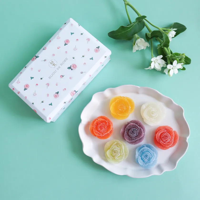 7色の美しいバラのグミを小箱に詰め込みました。可愛らしいバラの形は、まるで宝石のようで、一輪でも圧倒的な存在感を放ちます。日常のちょっとした贈り物や手土産にも最適で、きっと喜んでいただけること間違いなしです。パーティーなどでお皿に並べて「食べる装飾」として彩ることもでき、大変華やかです。