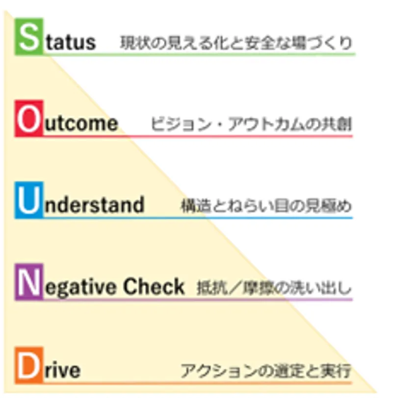 ・SOUNDカード(TM)は、社員が実際に気になっている生のテーマや職場の目の前で遭遇している問題を題材に具体的な会話ができるように設計されています。それにより、職場のありがちな四大症状(「言いたいことを言わない」、「見ている方向がバラバラ」、「他人事/タコつぼ化」、「視座が低い」)の解決を可能にします。