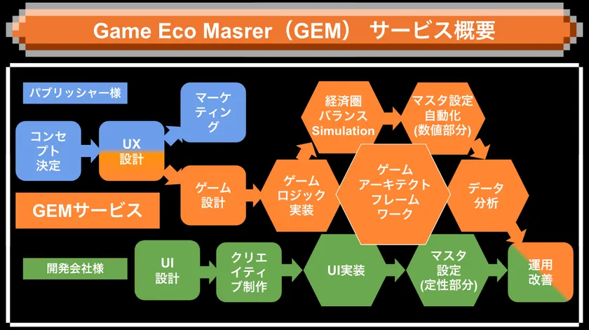 新たなサービス「GEM」は、ゲームのコンセプトを徹底的に理解した上で、ゲームユーザーに提供したい体験ポリシー(UXポリシー)を整理し、ロジックや数値に落とし込むことで、全体から細部まで一貫したゲーム経済圏の設計・実装を行います。