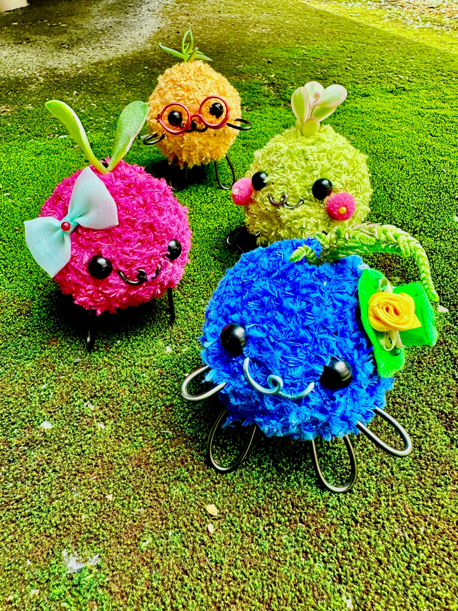 乾燥苔玉にパーツや植物を付けてオリジナルの「モスペット」を作成。