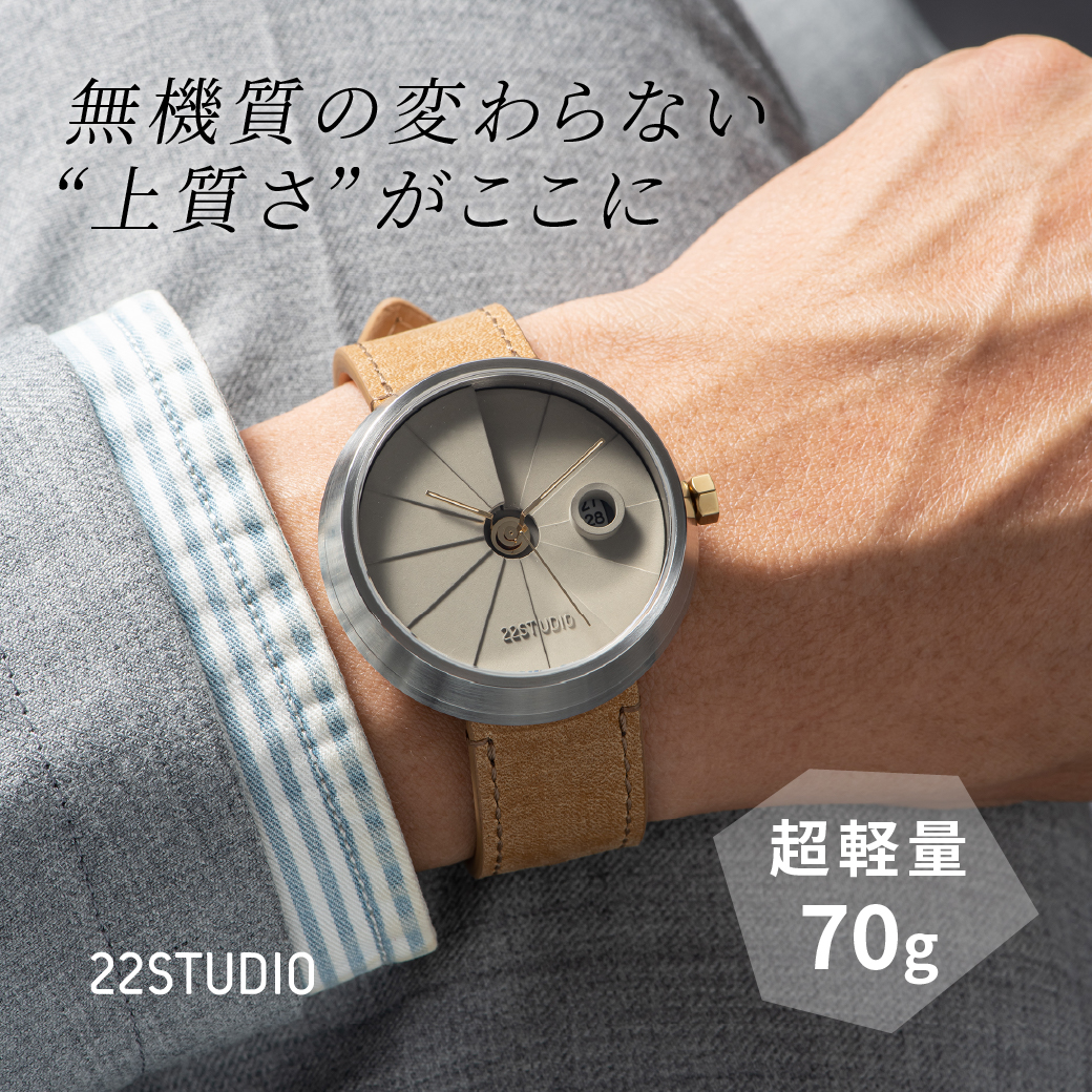 今回シリーズ最軽量モデルの4Dコンクリート時計は“70g”という驚きの軽さを誇ります。腕時計の平均的な重さは100~150gと言われており、100gを切るととても軽く付けやすい時計となります。