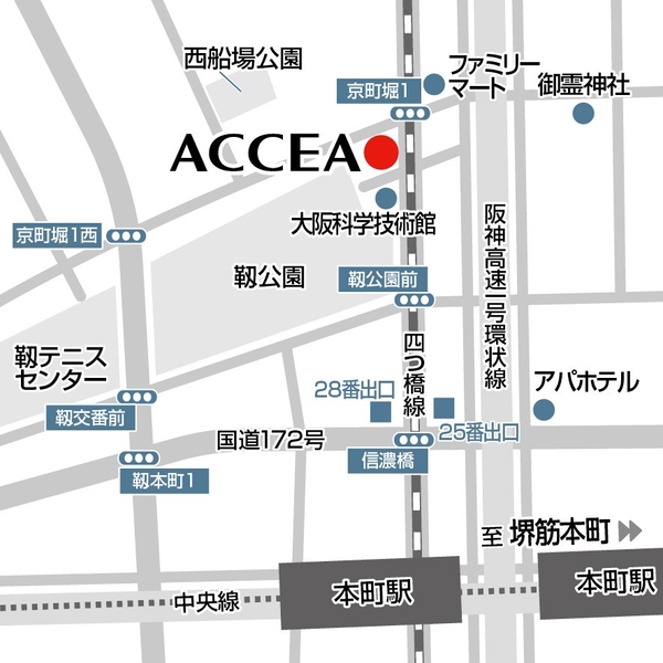 「アクセアアクセア靭公園店」は大阪メトロ肥後橋駅7番出口から徒歩4分の駅近大型店舗です。