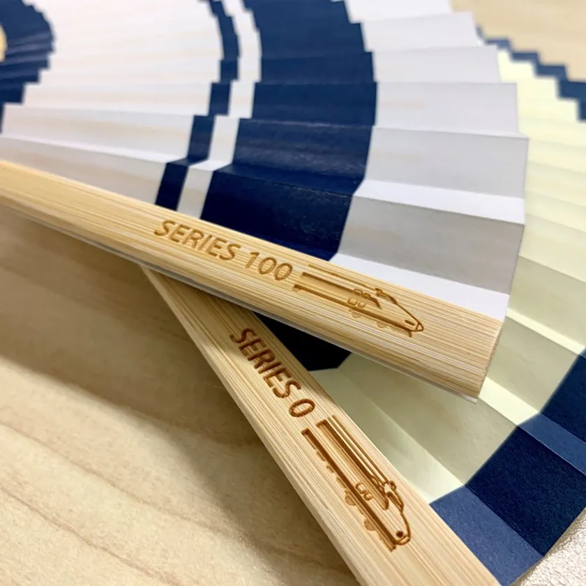 享保三年(1718年)に創業した京都の老舗扇子専門店「白竹堂」とコラボレーションしたオリジナル扇子です。表面は100系の車体カラーをイメージし、裏面にはピクトグラムをデザインしました。親骨には100系のイラストが彫刻されています。暑い夏の日の普段使いのほか、ギフトとしてもご利用いただけます。