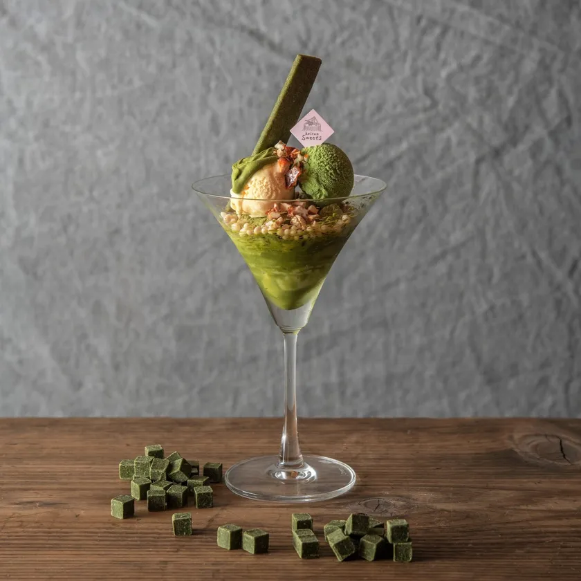 抹茶ガナッシュ、静岡県産の抹茶と丹那牛乳で作った口溶け滑らかな濃厚抹茶プリン、ダイスカットした大人気レギュラーメニュー「静岡抹茶のバスクチーズケーキ」、丹那牛乳使用のバニラアイスクリームと濃厚抹茶アイスクリーム、キャラメリゼしたカリカリ食感のナッツ、静岡抹茶を使用したオリジナルサブレを重ねた、抹茶づくしの贅沢なパフェ。