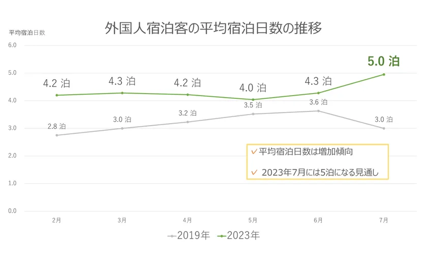 平均宿泊日数は2019年には3泊前後で推移していましたが、2023年は増加傾向にあり、7月には5泊に達する見通しです。