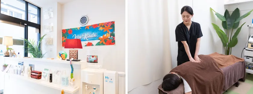 「いちょう街道整骨院」受付(左)と、施術の様子