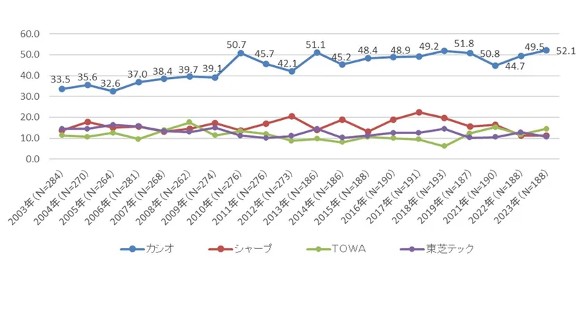 単独利用の電子レジスターは調査を開始した2003年以来、「カシオ」が20年連続でトップを維持しています。