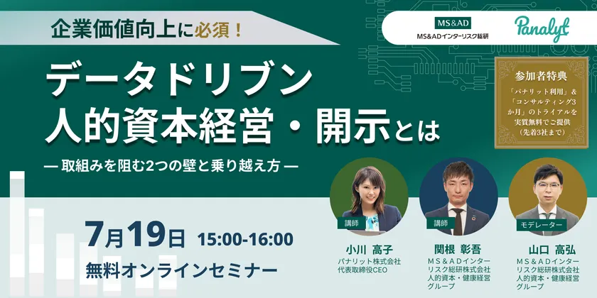MS&ADインシュアランス グループのMS&ADインターリスク総研株式会社(代表取締役社長:一本木 真史)は、7月19日に人的資本経営・開示の実践をテーマとした無料のオンラインセミナーを開催します。後述の“2つの壁”を乗り越えていくために、本セミナーでは「人事データの可視化」および「人的資本経営・開示を観点とした人事データの活用方法」についてそれぞれの専門家より解説します。