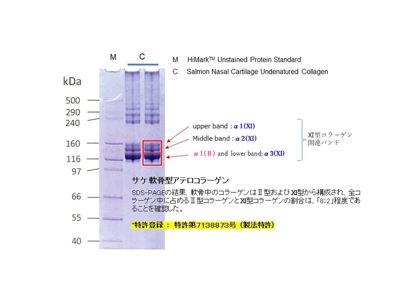 下記画像は、サケ鼻軟骨から特許製法(特許第7138873号)により抽出したアテロコラーゲンのSDS-PAGE(ポリアクリルアミド電気泳動)結果です。