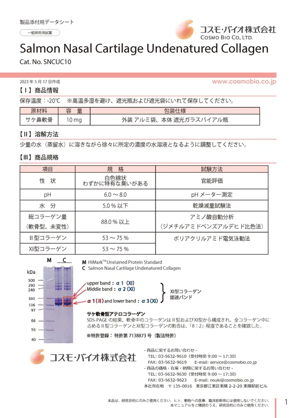 食品原料「SCPコンプレックス-LS」の規格変更とは別に、研究用試薬(サケ軟骨型非変性II型・XI型コラーゲン)をコスモ・バイオ株式会社より販売いたします。販売開始は2023年7月~を予定しております。