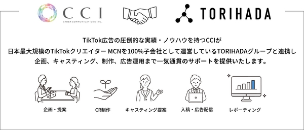 株式会社CARTA HOLDINGSのグループ会社である株式会社サイバー・コミュニケーションズ(本社:東京都中央区、代表取締役社長:新澤 明男、以下CCI)は、株式会社TORIHADA(本社:東京都目黒区、代表取締役社長:大社武、以下TORIHADA)と協業し、TikTok広告の企画・キャスティングから制作までワンストップで提供するサービス「TOMAKASE」の販売を開始します。