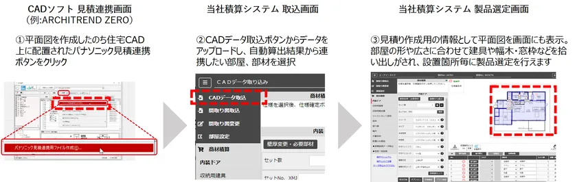 パナソニック ハウジングソリューションズ株式会社(代表取締役社長:山田 昌司、本社:大阪府門真市、以下 当社)は、当社「Webハウズ(※5)間取り図積算システム」(以下、積算システム)に住宅CADソフト(※2)3社(福井コンピュータアーキテクト株式会社、株式会社 コンピュータシステム研究所、株式会社 DTS)の平面図情報を取り込み可能な「CAD連携機能」を搭載。建材製品(※3)の拾い出しを効率化、見積り時間の約40%(※4)削減につながるサービスの提供を開始しました。