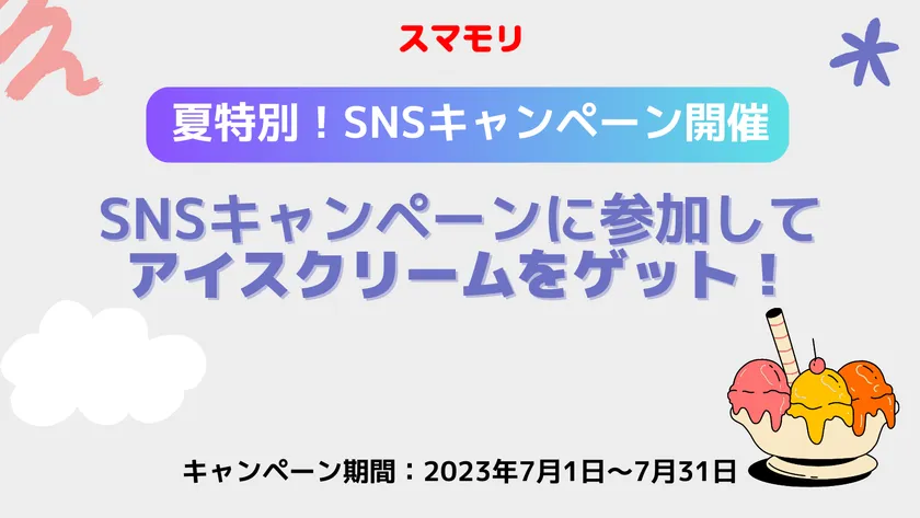 ようやくお出かけに関する規制も緩和され、夏休みの予定を考えている方も多いのではないでしょうか。暑い夏休みを乗り越えてもらうため、「スマモリ」からアイスクリームが抽選で当たるキャンペーンをご用意いたしました。
