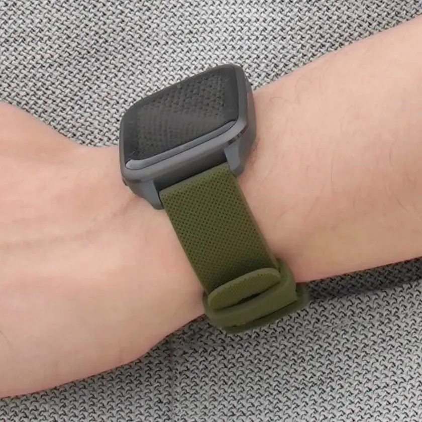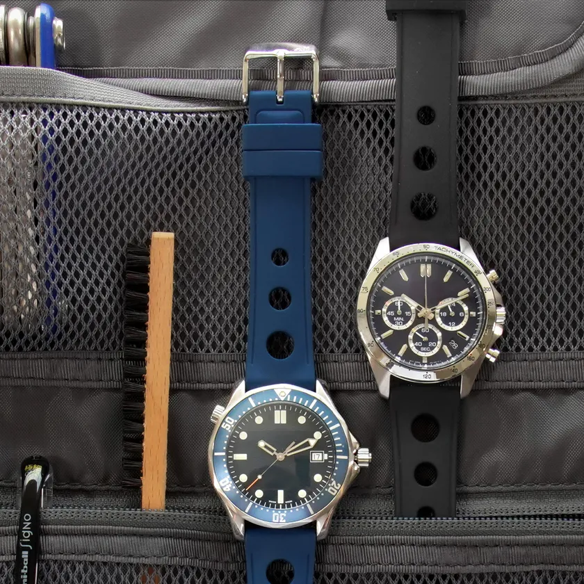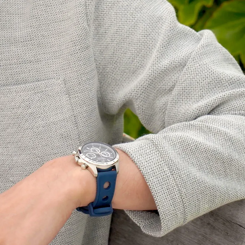 大きな穴のデザインが印象的なシリコンベルト。最大厚5.5mmと厚みがあり、シリコン素材でありながらどっしりとした高級感が特徴です。裏面の溝の加工と中央に大きくあいた穴によって、通気性が確保され、着け心地も快適。厚みのある甲丸と、サイドの溝によってシャープな見た目のデザインも魅力的なスポーティーな一本です。