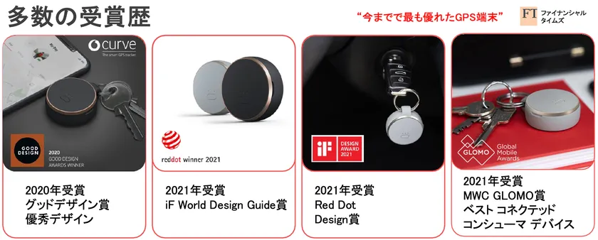 2020年のグッドデザイン賞・優秀デザイン賞、2021年のiF World Design Guide賞、2021年のRed Dot Design賞、2021年のMWC GLOMO賞などを受賞しました。FT(Financial Times)からは、「今までで最も優れたGPS端末」と評価されました。