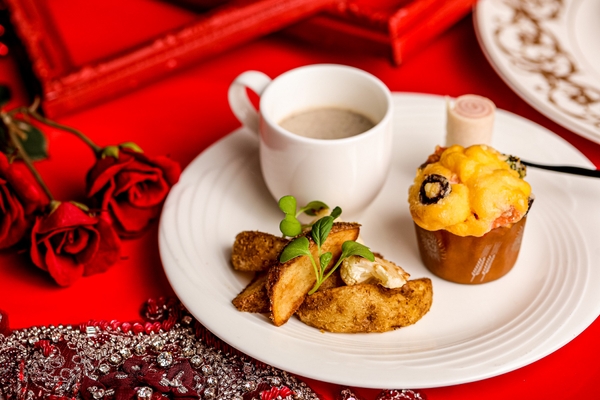 ノルウェーサーモンのケークサレ / ロースハムのキャンディーロール / カリフラワーとポテトのフリット / マッシュルームのポタージュ