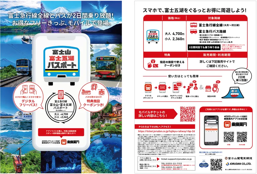 ジョルダン株式会社(本社:東京都新宿区、代表取締役社長:佐藤 俊和、以下「ジョルダン」)は、2023年7月5日(水)より、富士山麓電気鉄道株式会社(本社:山梨県南都留郡富士河口湖町、代表取締役社長:上原 厚、以下「富士山麓電気鉄道」)が運行する富士急行線の企画乗車券「富士山・富士五湖パスポート(富士急電車セット)」をスマホで買えるモバイルチケットで販売開始します。