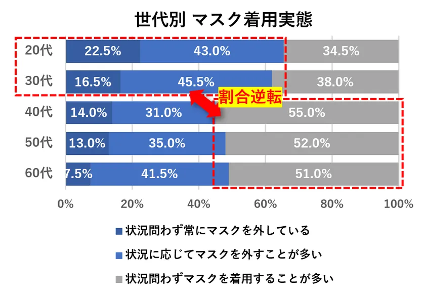 また、若年層やミドル世代は、屋外にいるときは外し、人込みでは着用するなど状況に応じてマスクを活用するのがいいでしょう。