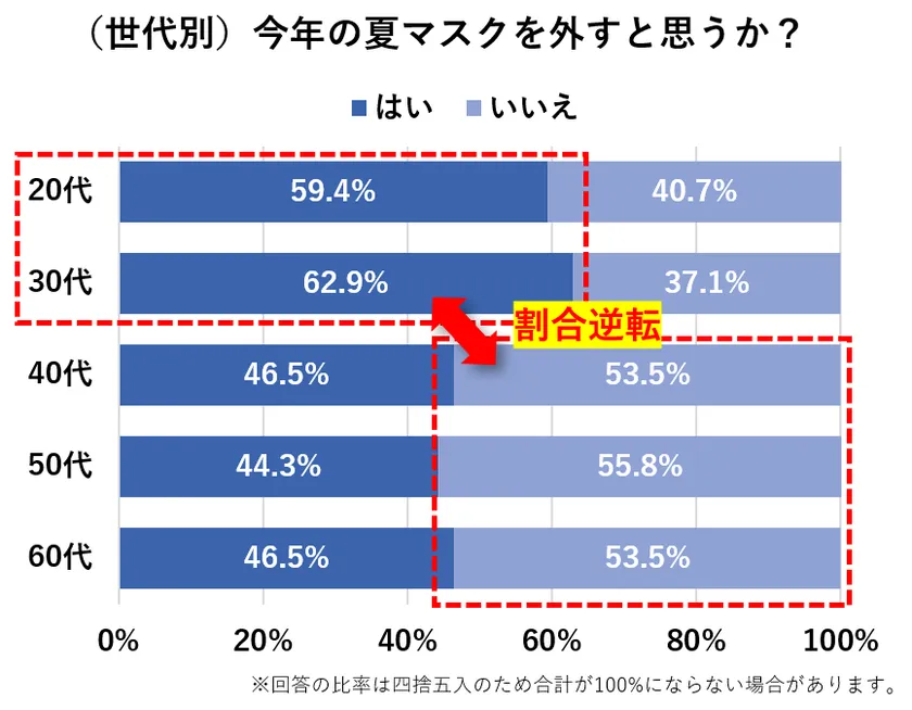 ・今年の夏にマスクを外すと答えた人は、昨年時とくらべ2.5倍増。20代~30代では約6割が外すと回答し、40代以降とは意向が異なった(Q3)