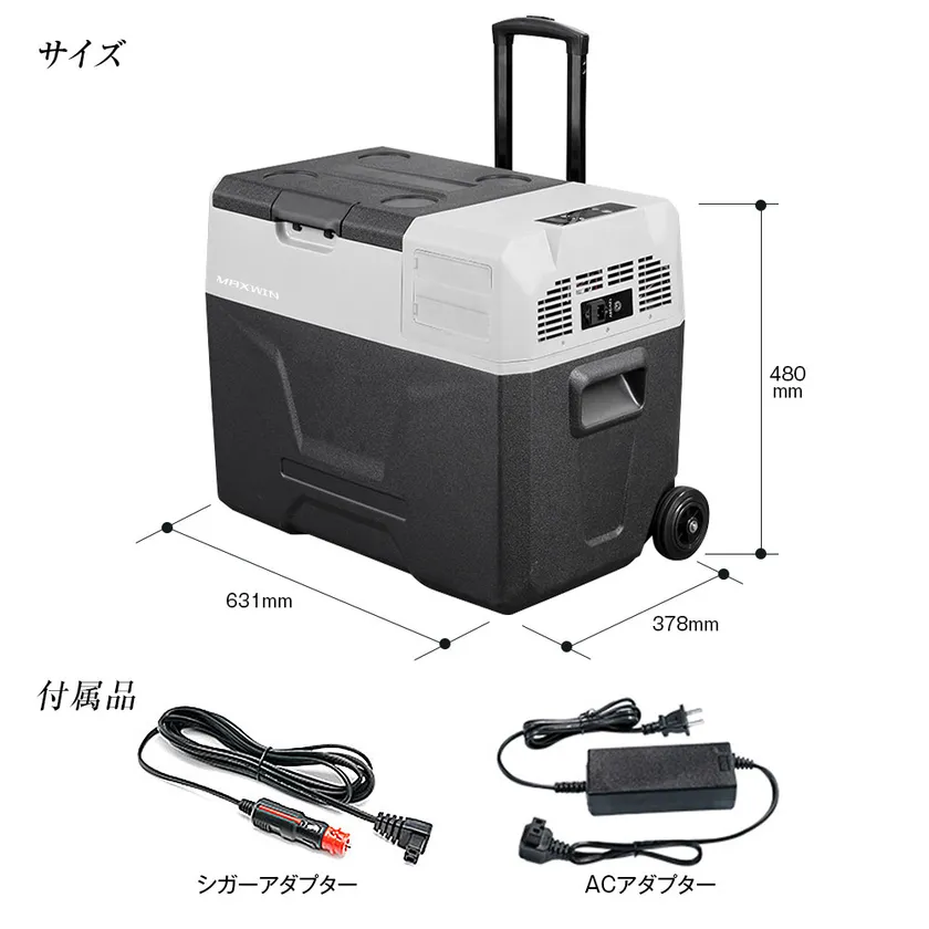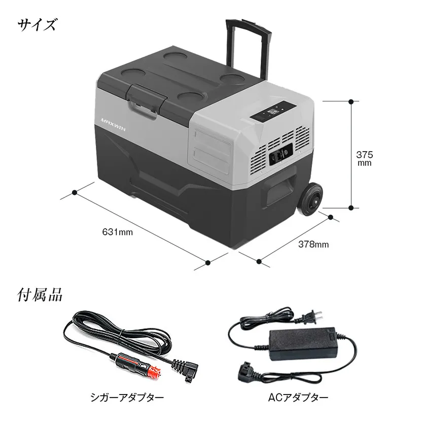 電源の場所で利用の必須アイテムでMAXWINの車載冷蔵庫「K-IBOXシリーズ」に適合します。