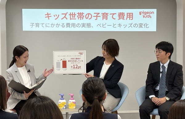 「キッズ世帯の子育てにかかる費用の実態」というテーマでは、ピジョンが独自に実施した調査結果を発表。子育てにかかる月々の費用や家計への圧迫感は、0才児世帯と比較し、キッズ世帯が上回る結果に。一方で、年齢を問わず付加価値の高い商品が選ばれていることが分かりました。この結果に対して遠藤氏は「欲しいものにはお金をかける一方、それ以外のものには財布の紐を締めるという二極化が、近年の消費行動の特徴。調査結果から、この傾向がベビー・キッズ用品市場にも当てはまることがわかった。より価値の高いもの、訴求力のあるものが選択される傾向が明らかになったと思う」と解説しました。武藤は、「ブランドの構想にあたりご家族へインタビューをしていくなかで、子どもの年齢が上がると日用品や消耗品については価格の安い一般用の商品に切り替える家庭も見られた。一方で、“子どもには良いものを使ってあげたい”という想いも多く聞かれ、だからこそ、キッズ向け商品ならではの良さや必要性などの付加価値を重視して、ご家族に寄り添い続けていきたい」と語りました。