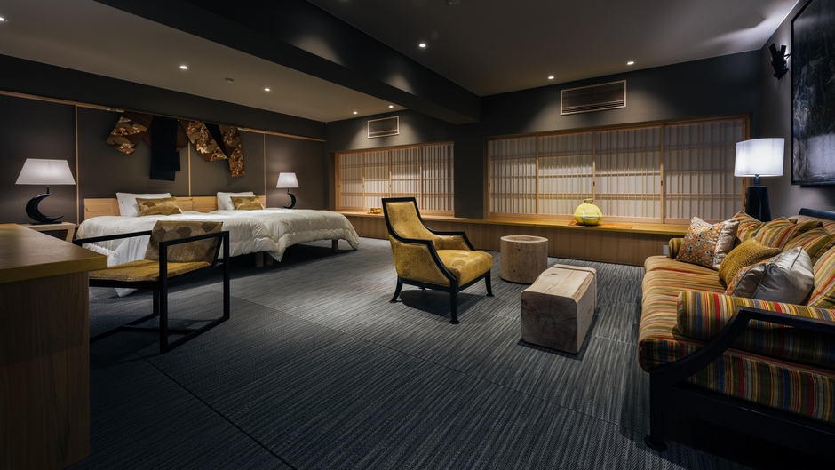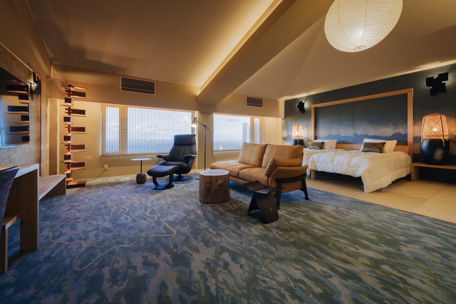 屋内は、元の旅館にあった意匠の一部が残された伝統を未来へつないでいく空間。リビングダイニングの役割を果たす二間続きの和室からは熱海湾の景色が望め、浴室は源泉かけ流しの温泉がいつでも楽しめる檜風呂となり、心と体を癒すくつろぎのバスタイムが過ごせます。また、ベッドルームにはこだわりのインテリアがふんだんに配置され、伝統とアートの調和を演出します。