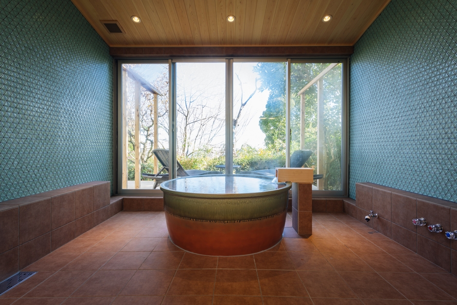 奥のダイニングスペースはヒノキの間伐材を使用した大きなダイニングテーブルに、大きな窓とその先にはテラスがあり海を見晴らす絶景をお楽しみ頂けます。2種類の浴室はそれぞれ信楽焼・桐の浴槽を備え付け熱海の温泉を楽しむことができます。2階・3階には計4つの客室があり、3人の国際的なデザイナーによって異なるコンセプトでデザインされており、伝統技法やデザイン技術、アートが凝縮された客室です。
