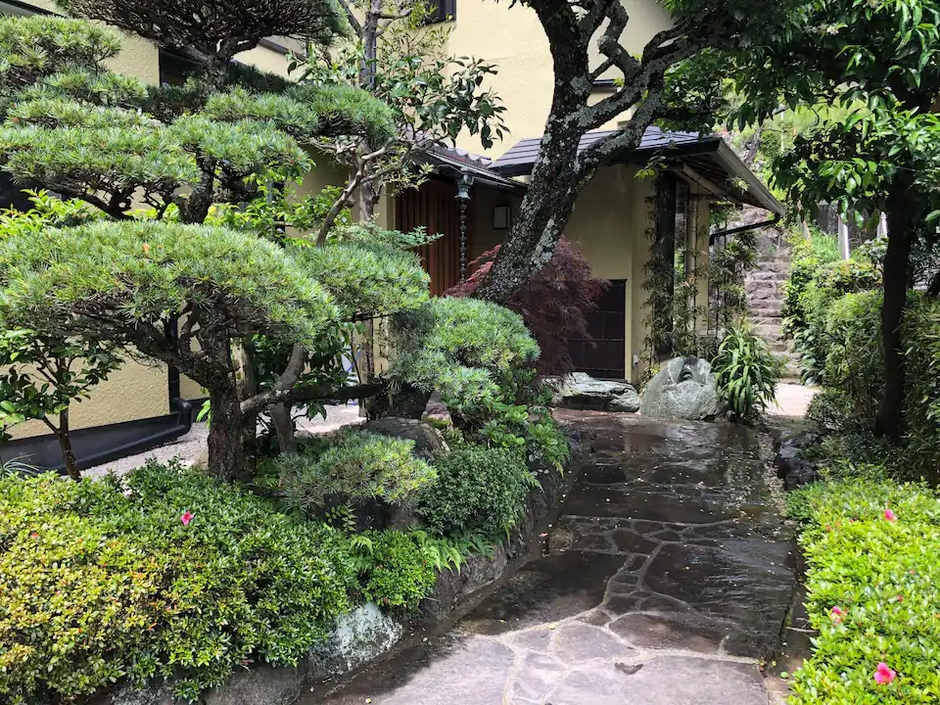 本物件は、熱海駅から徒歩7分の海を見下ろす閑静な住宅地に佇むこだわりの貸別荘。その一部を利用する「アネックス利用」の施設となっています。門から玄関までのアプローチには夏蜜柑や梅、松などの様々な植物が配され、四季折々で情緒を演出します。