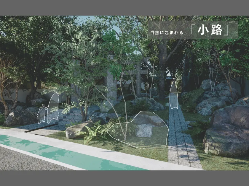 ●植栽も見直し、季節の移ろいとともに彩りを変える木々や花々を植えます。御神木などの古樹は残し、数十年かけて鎮守の森になるよう設計します。