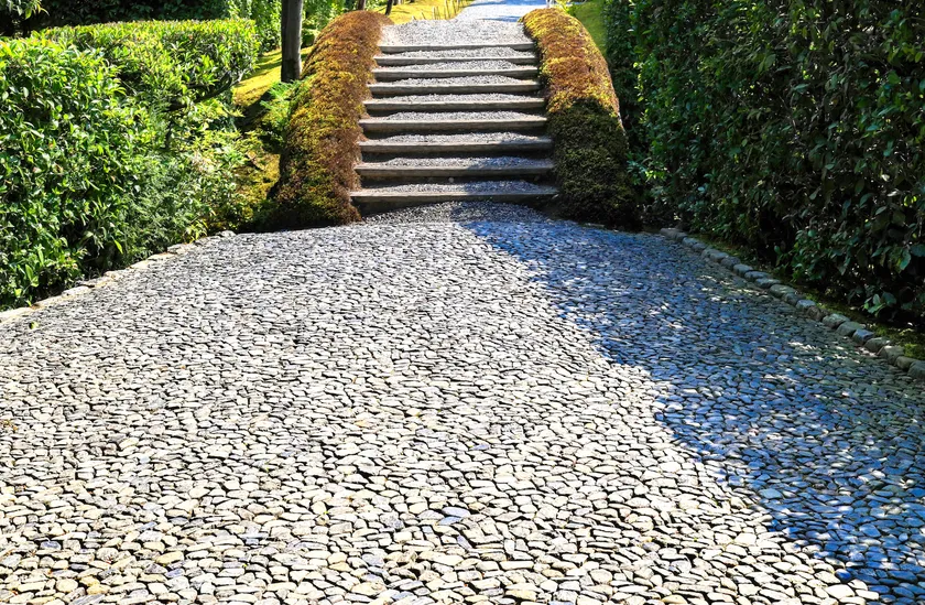 ●参道の正中線(真ん中の線)は神様が通る道とされています。正中線の石畳を庭師の最高の技術といわれる「あられこぼし」でしつらえます。