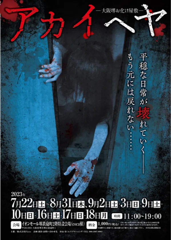 イベント企画 エス・プランニング(所在地:広島県広島市、代表:杉山 悟)は、夏季限定のお化け屋敷を大阪でダブル開催することが決定いたしました。第1弾は2023年7月15日(土)~9月18日(月祝)の期間中、イオンモール鶴見緑地2階特設会場にて「イキモドリ」を開催。第2弾は2023年7月22日(土)~9月18日(月祝)にイオンモール堺鉄砲町2階特設会場で「アカイヘヤ」を開催いたします。(※いずれも9月は平日休業)