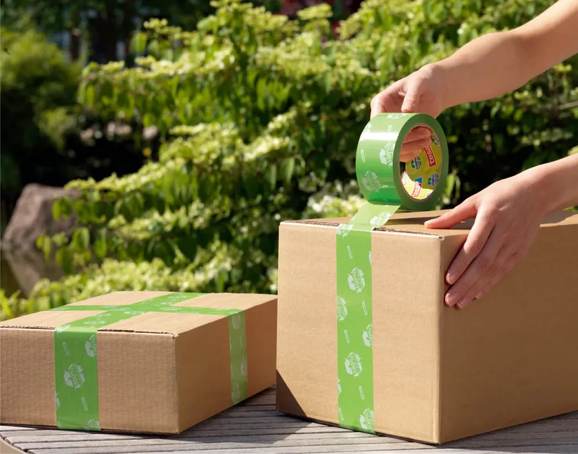 tesa(R) 60412は、ポストコンシューマーリサイクル材料(PCR)を70%使用したPET基材と、水系アクリル粘着剤を組み合わせた梱包用フィルムテープです。高い強度と耐摩耗性があり、切れや破れへの耐性に優れます。段ボールについたままでも古紙としてリサイクルできる特徴をもつtesa(R) 60412は、脱墨(だつぼく。古紙を再生する工程でインキを取り除くこと)の国際団体が定めるINGEDE 12規格の認証を受けています。テープ表面はあらゆる種類のインクシステムで優れた印刷性を発揮するため、ブランドロゴの表示や広告ソリューションとしても使用することができます。