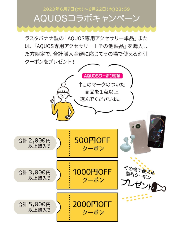 株式会社テレホンリース(本社:愛知県名古屋市中区)は、6月7日よりラスタバナナ製のAQUOS専用アクセサリーがお得に購入できる「AQUOSコラボキャンペーン」を、通販サイト「ラスタバナナダイレクト」にて開始しました。