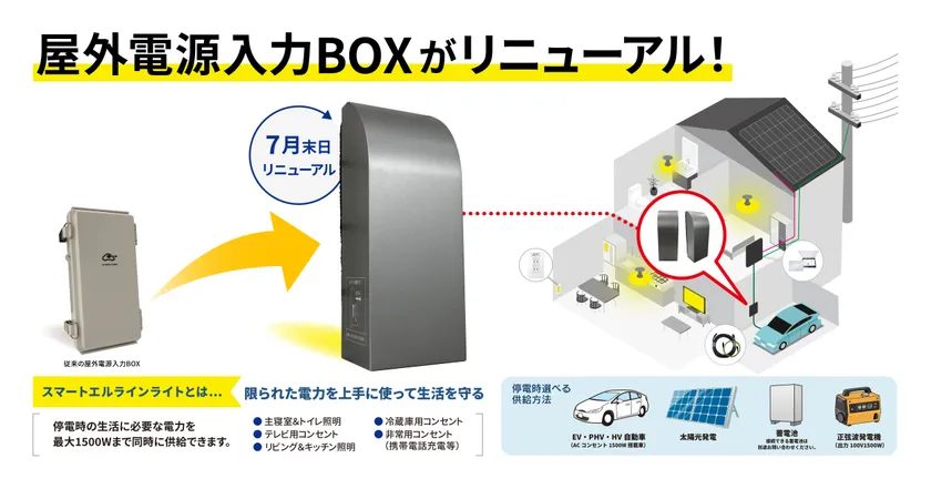 太陽光、ハイブリッド車等から住宅給電可能なシステム 「スマートエルラインライト」の屋外電源入力BOXを 7月末日より製品リニューアルを実施