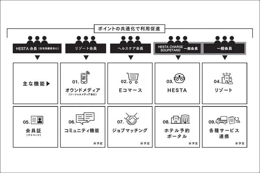 「HESTA LIFE」アプリでマイアカウントを作成すると、全てのサービスで利用出来る「HESTA LIFEポイントサービスシステム」を導入しました。(一部開発中)たとえば、HESTA CHARGE(レンタルモバイルバッテリーサービス)との連携により、ポイントでバッテリーをレンタルできるだけでなく、リゾート施設やオンラインストアでのポイント利用や付与、住宅購入やリフォームでのポイント付与など、全事業を横断したポイント利用が可能です。