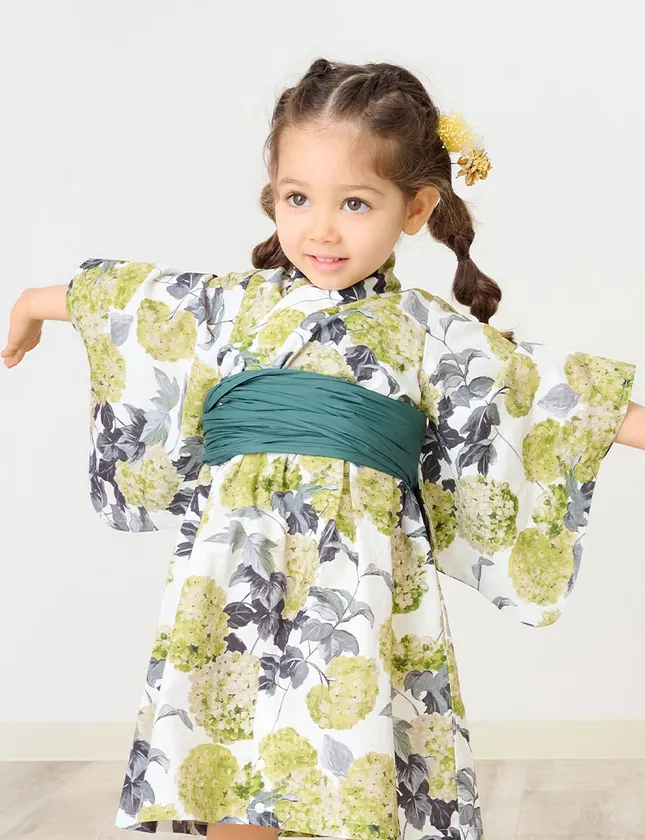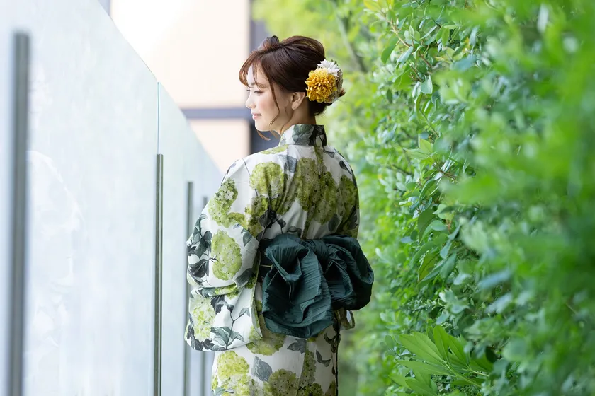 珍しいグリーンと白基調のアジサイが印象的なデザイン。グリーンの濃淡で表現された現代的なアジサイは息をのむほど美しく、モスグリーンの帯で涼しげな凛とした姿に。和洋コラボのシンボルとも言える、今期コレクションの代表作です。